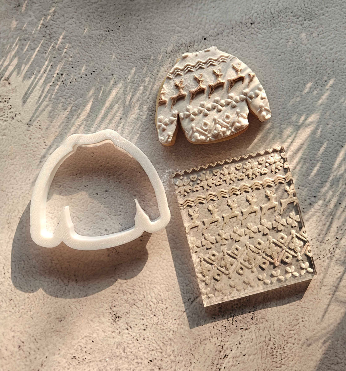 Bring holiday cheer to your kitchen with our Christmas Sweater Cookie Cutter + Embosser Set. This 2-piece set allows you to cut the perfect sweater shape and add beautifully embossed holiday details for professional-looking cookies.